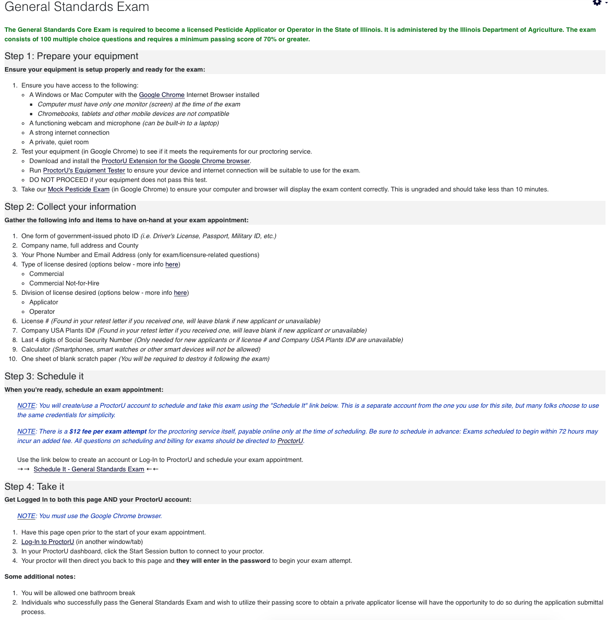 The Illinois Dept of Ag is aware of the problem and is taking immediate steps to address this issue. They hope by the middle of next week the issue will be resolved. So be patient, and if you have an appointment early next week to take the exam, if you get kicked out of the program, you can pick up where you left off or reschedule to a later time to complete your exam. If you haven't scheduled an on-line exam yet, you might want to give it until the end of next week to improve your chances of enjoying an uninterrupted experience. Patience is a virtue!